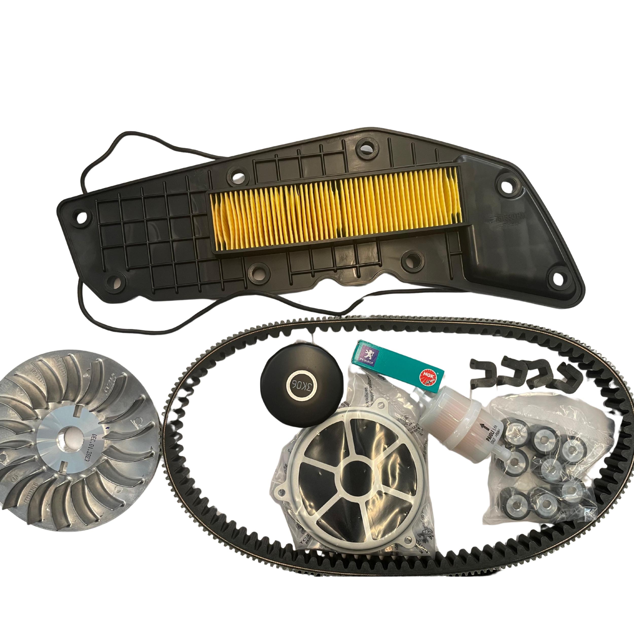 KIT REVISION ORIGINAL PARA PEUGEOT METROPOLIS 400i COMPUESTO DE: CORREA, RODILLOS, GUIAS, BUJIA, FILTRO DE AIRE, FILTRO DE TAPA VARIADOR, FILTRO DE GASOLINA, FILTRO DE ACEITE, SEMI POLEA DE VARIADOR, JUNTAS TORICAS Y ARANDELA DE VACIADO.