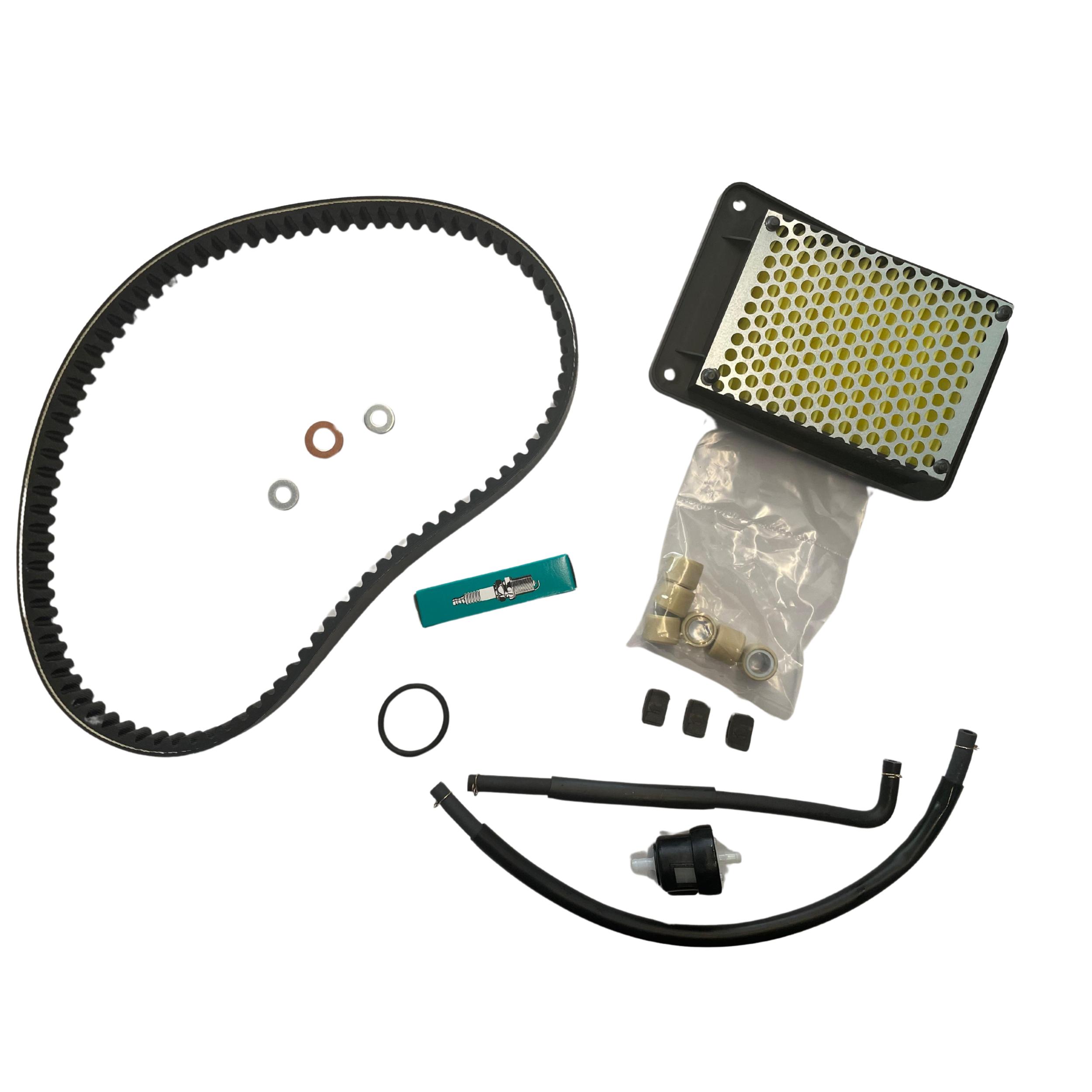 KIT DE REVISION ORIGINAL PARA PEUGEOT TWEET 125 CARBURACION , COMPUESTO DE FILTRO DE AIRE, BUJIA, FILTRO DE GASOLINA, CORREA, RODILLOS, GUIAS, TORICAS Y ARANDELAS DE VACIADOS.